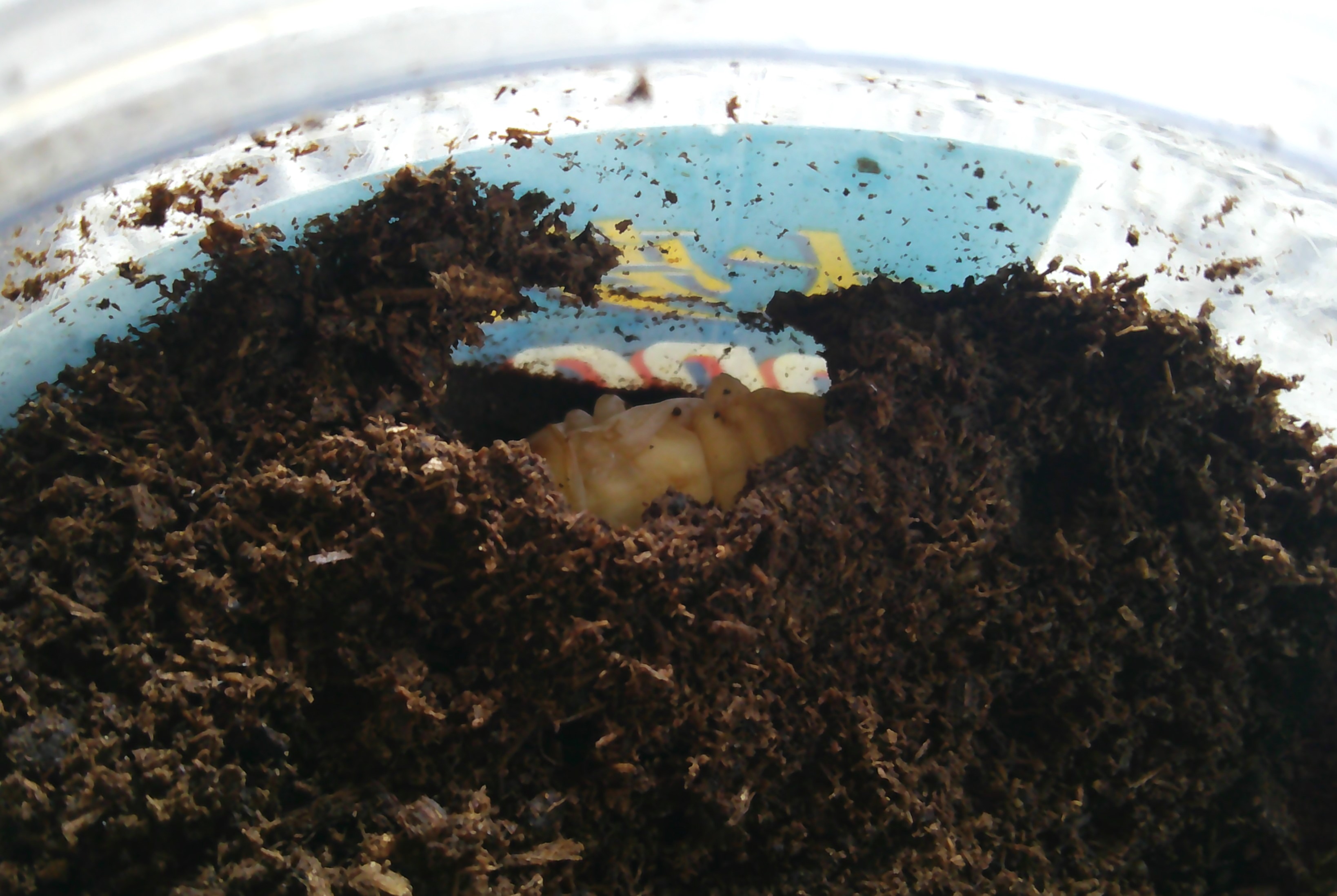 この画像 意外と貴重です。糞で蛹室の壁を塗り固めた部分とマットの境が