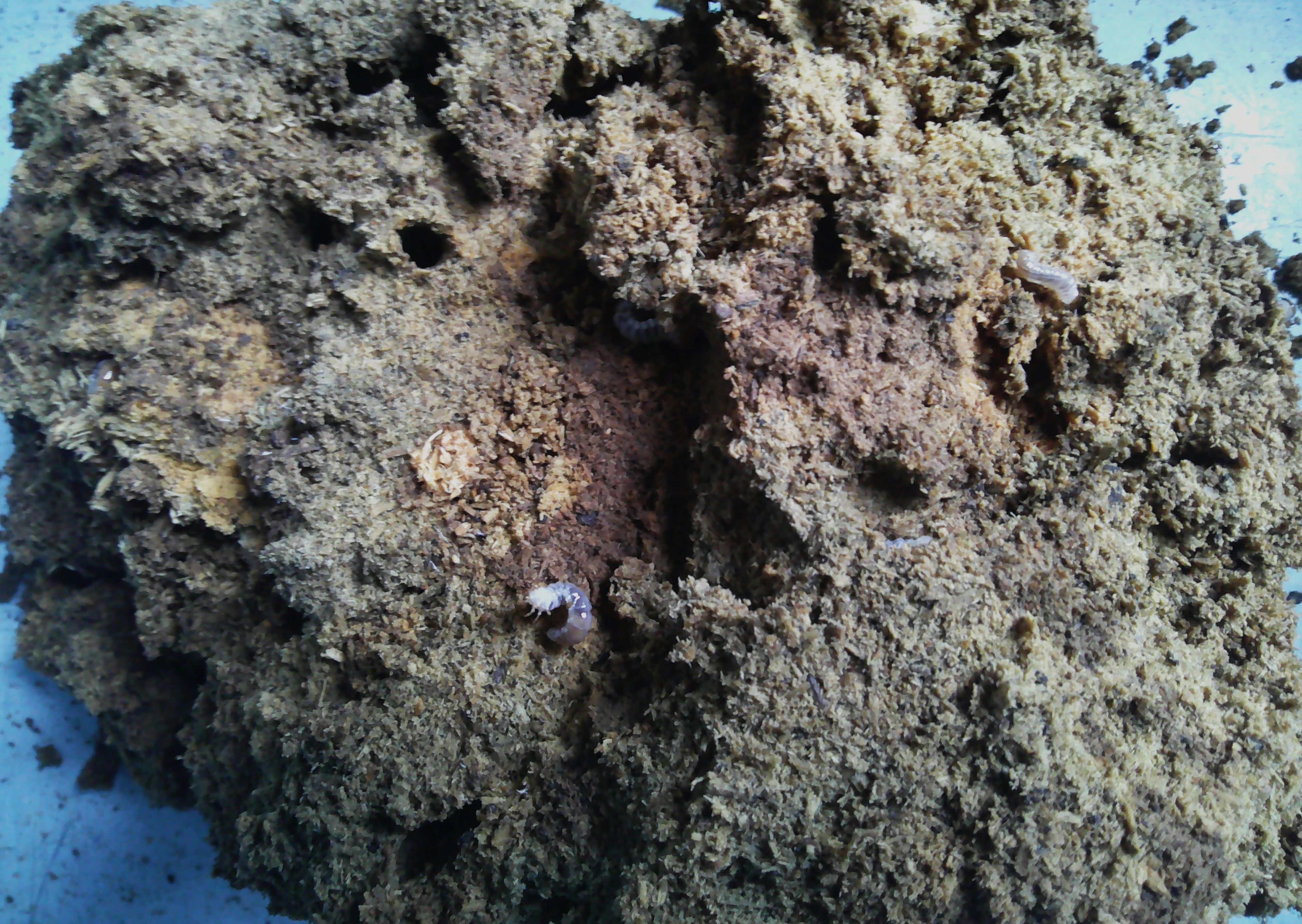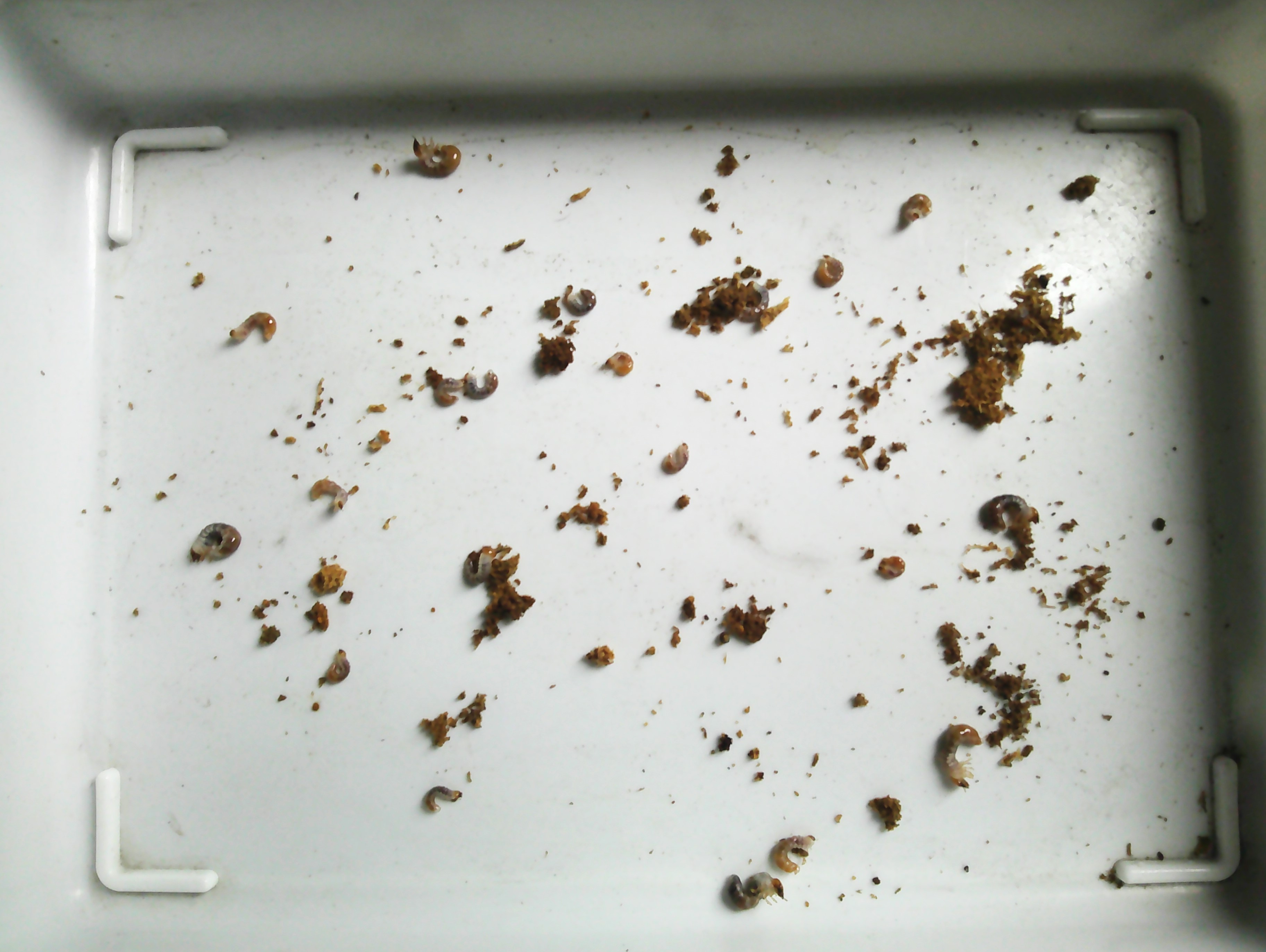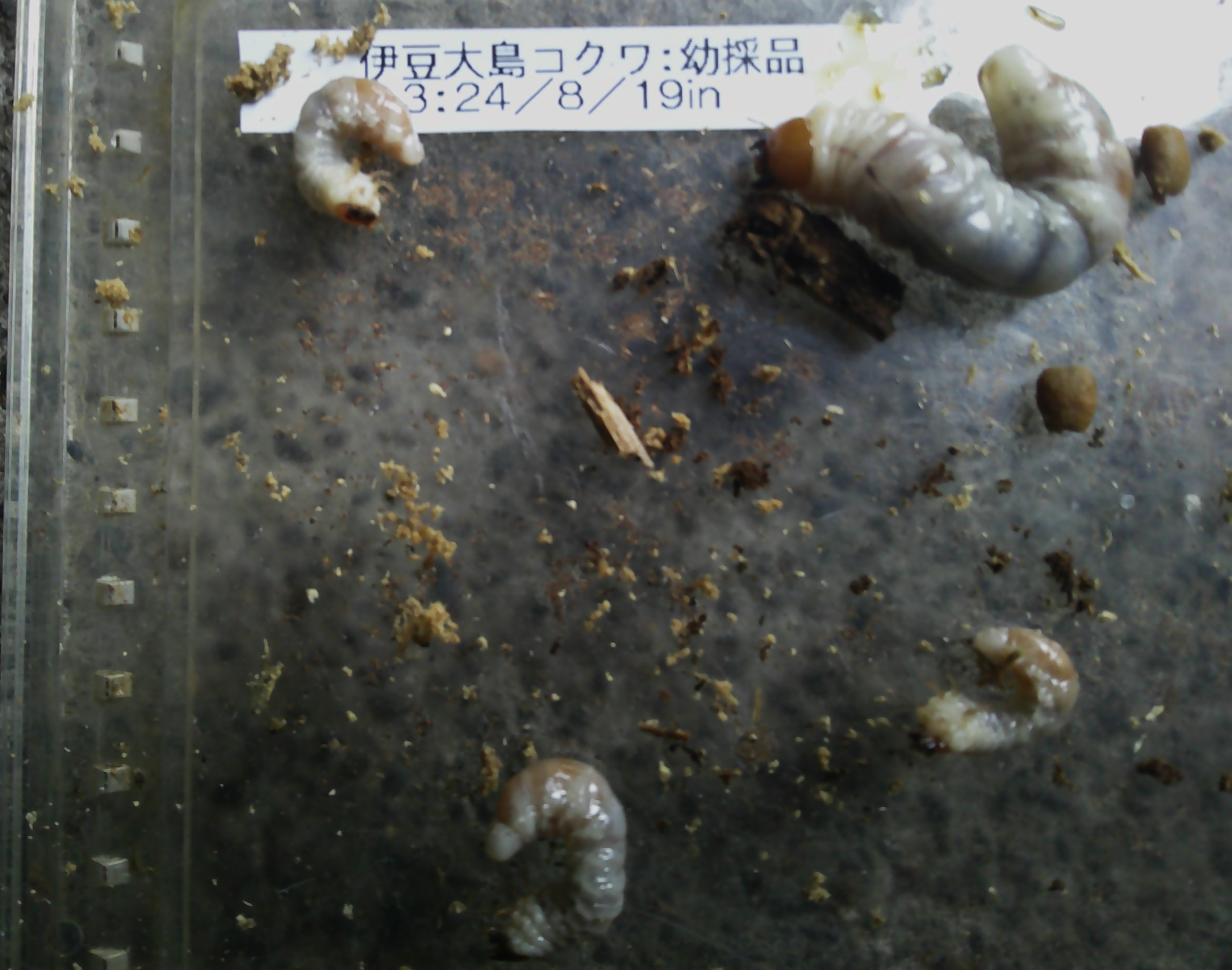 材周りのマットと材から出した幼虫。ド初令が多いですね。。